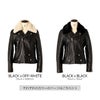 メンズライクなボックス型の胴回り、 ブラックとホワイトの2色から選べるリアルムートンの襟ボア (取り外し可能)、アクセントとなるシルバーのスナップボタンなど、デザインの拘りを詰めた、 魅せるダブルライダース誕生。