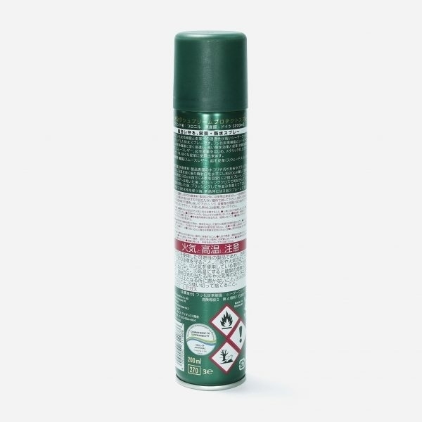 1. 対象製品表面のホコリや汚れを布やブラシで落として下さい。2. 容器を良く振り噴射口を水平にし、約20cm離して表面が軽く湿る程度(30cm四方に4秒を目安)に2回スプレーして下さい。3. スムースレザーは乾いた後、ポリッシングクロスで乾拭きして下さい。起毛皮革は乾いた後、クレープブラシでブラッシングして毛並みを整えて下さい。・バッグやウェアなど広範囲なものに使用する場合は、アルファベットのZを書くようにスプレーすると全体にまんべんなくかけることができます。・新しいヌメ革やマットな仕上げの羊革等、クリームやローションを塗るとシミとなってしまう恐れのある革に油分を補給するのに最適です。・乾燥後の乾拭きによってツヤのある仕上がりになります。マットに仕上げたい場合は、スプレー後に乾拭きしないことをおすすめします。(全くツヤを出さないことはできません)・同じ箇所に集中してスプレーすると液ダレの原因となりシミができる恐れがありますのでご注意ください。・防水効果の持続期間は約2週間です。定期的なかけなおしと、水に当たって防水効果を発揮した場合はかけなおしてください。