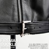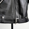 ロンジャンのスタイリッシュさと、 アメジャンの無骨さを、 独自の審美眼でミックスしたライダースです。 襟のサイズや形をはじめ、ファスナーの色やサイズ、ベルト内側の隠しスナップボタン、そしてファイヤーマンバックル etc、こだわりが詰まった逸品です。