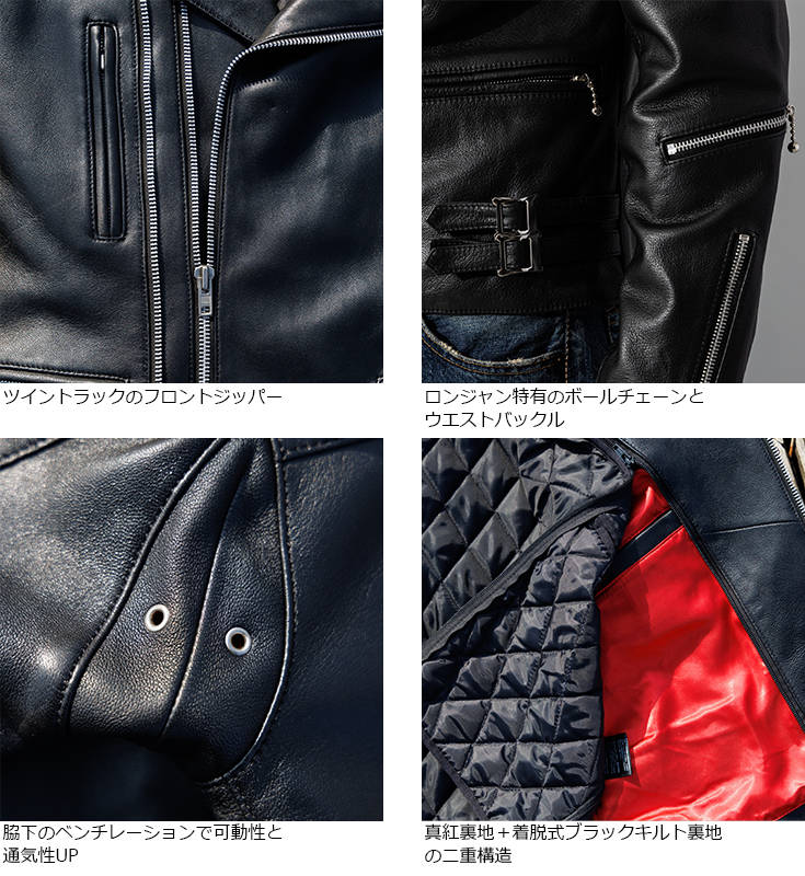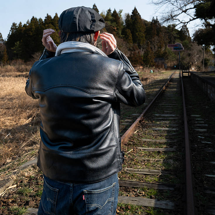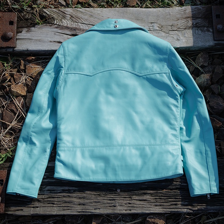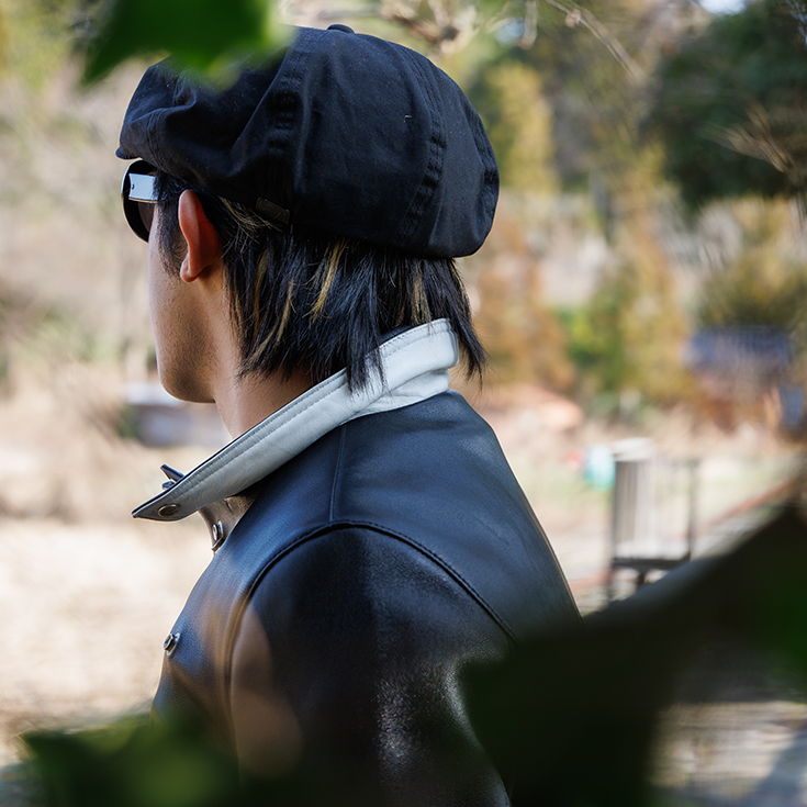 しなやかで上質なシープスキンを採用した一着。襟もとにはクラッシュ襟仕様へとアレンジ可能なスナップボタンを備え、襟裏にはホワイトを配したバイカラーを採用しました。フロントにはツイントラックジップを取り入れ、デザイン性を高めています。さらに、着脱可能なライナーを備えることで季節に応じた着用が可能。脇下にはベンチレーションを設け、可動性と通気性にも配慮しました。細部にまでこだわりを凝縮した、完成度の高いライダースです。