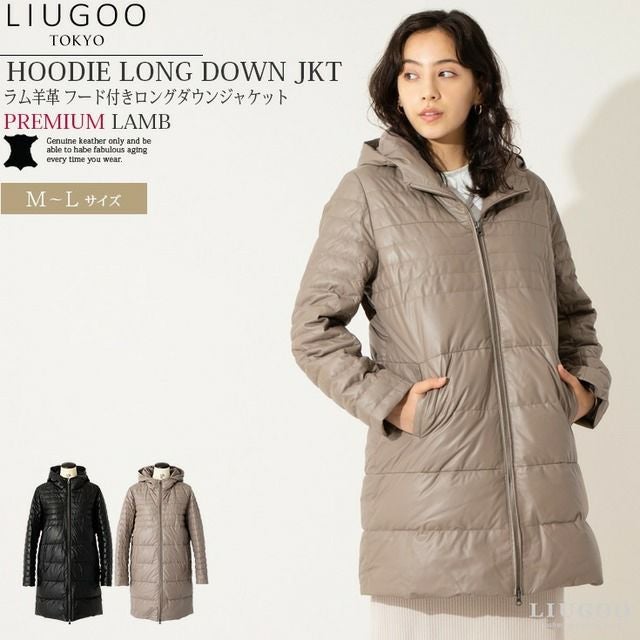 LIUGOO 本革 フード付きロングダウンジャケット レディース リューグー COT04LA レザージャケット ダウンジャケット